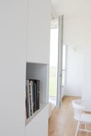 Zaprojektowany układ funkcjonalny, wraz z zabudową meblową, został dokładnie dostosowany do potrzeb użytkownika. W części korytarza wysokie, sięgające 330cm regały mieszczą setki książek, zbierane latami przez właściciela. Biblioteka, ulokowana w przechodnim hallu, powiększa przestrzeń użytkową.